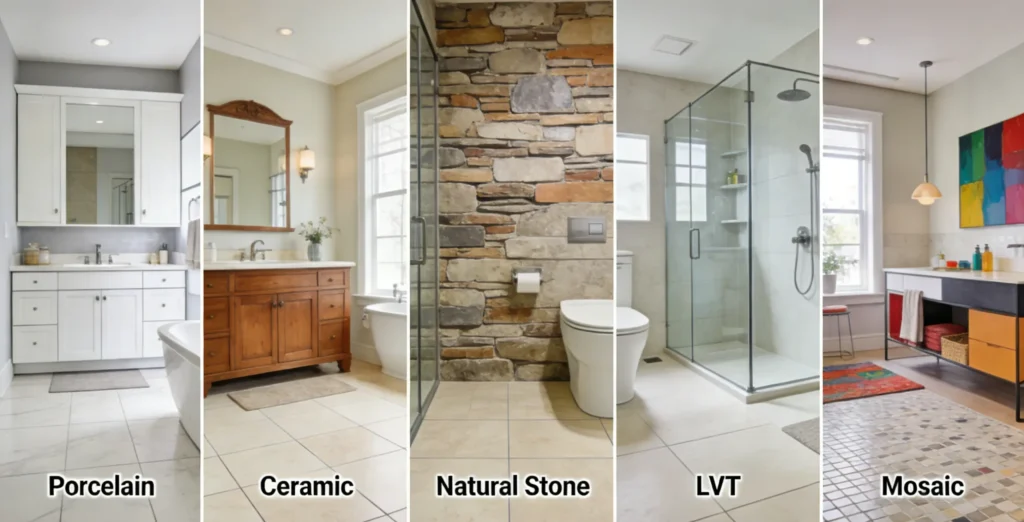 • Nano Banana Image Prompt: Side-by-side comparison collage of the top 5 bathroom floor tiles types (porcelain, ceramic, natural stone, LVT, mosaic), each in a realistic bathroom setting, bright even lighting, professional product photography, 8K resolution, clear material labeling, no watermarks.