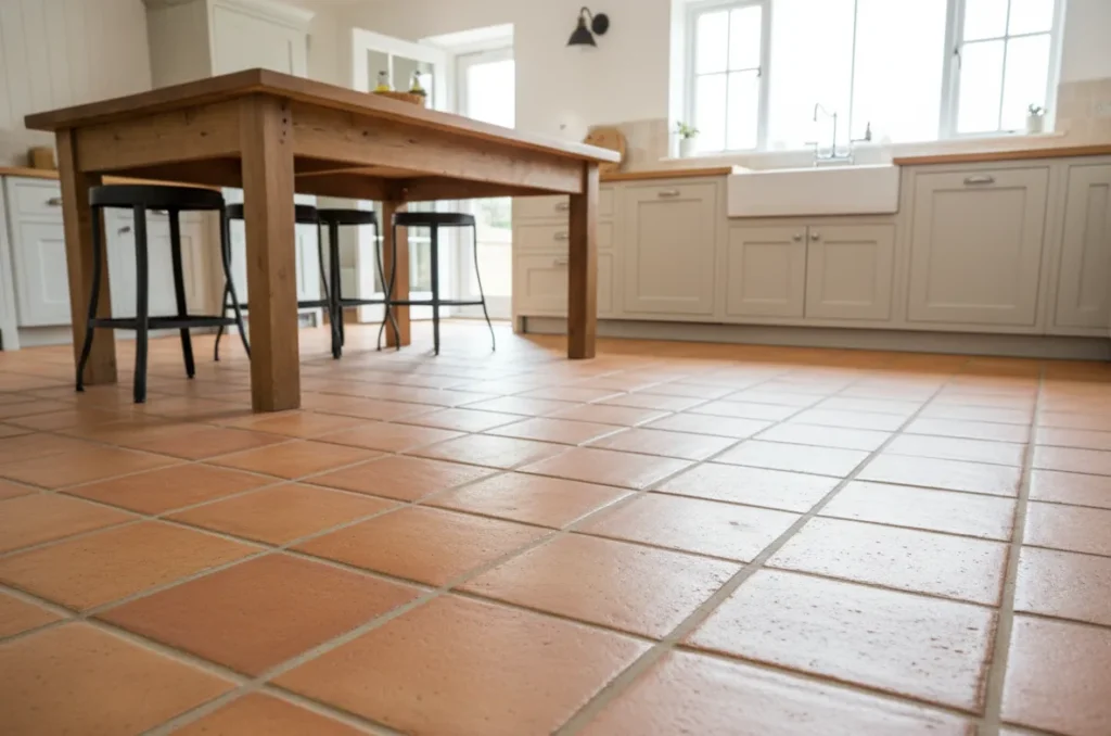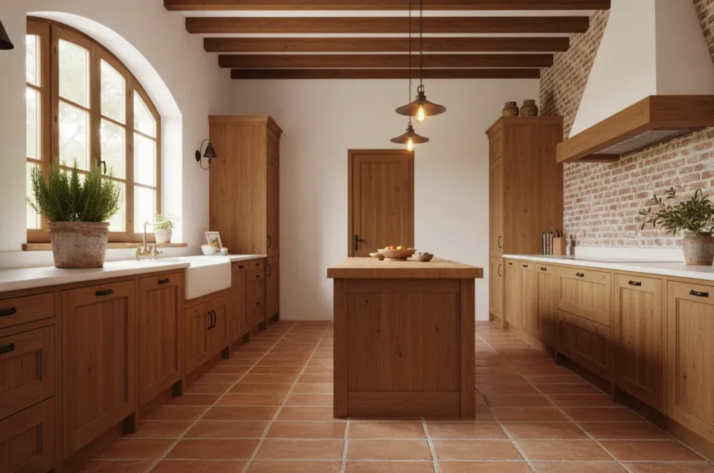 Kitchen Floors: Adds a cozy, farmhouse or Mediterranean vibe; pairs with wooden cabinets, white countertops, and potted herbs for a “rustic-modern” look.