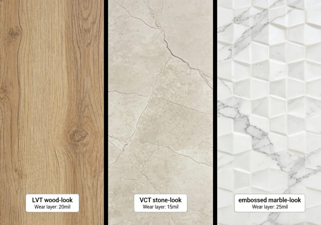 Type: LVT (Luxury Vinyl Tile, rigid, waterproof—best for bathrooms/kitchens); VCT (Vinyl Composition Tile, flexible, budget-friendly—ideal for dry spaces like bedrooms).