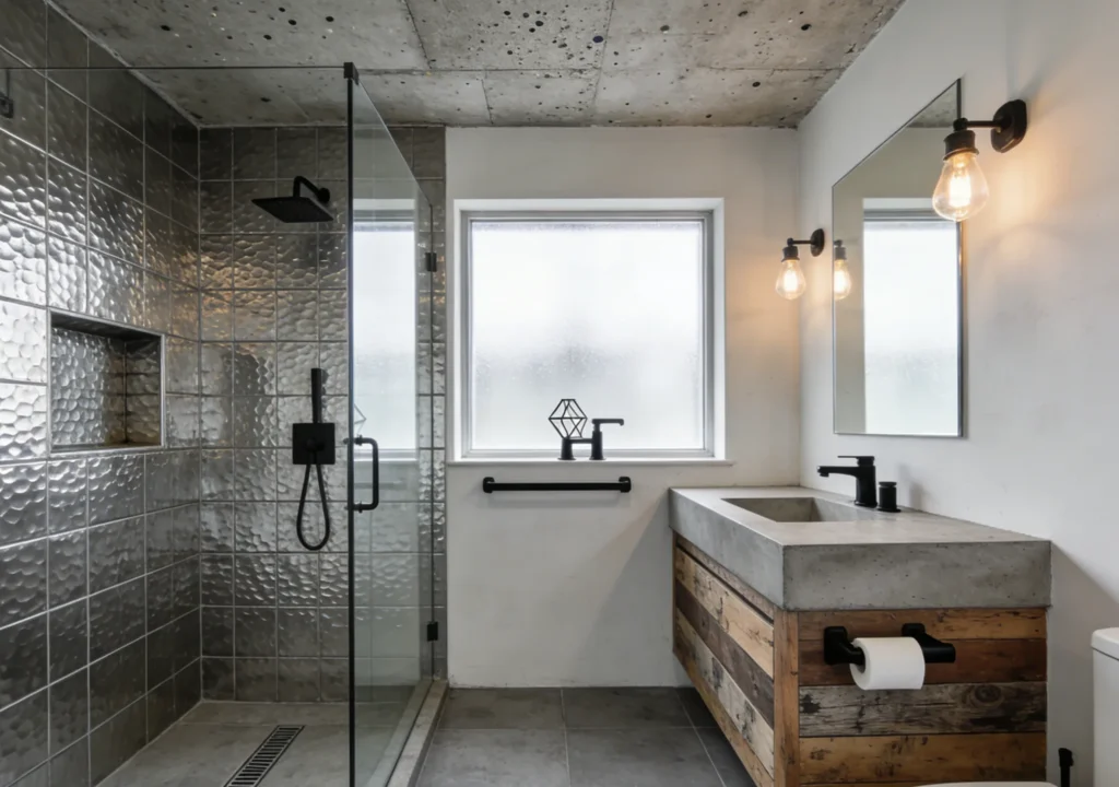 Image Prompt: Fully renovated industrial-style bathroom with hammered aluminum metal tile shower niche, paired with a concrete vanity, matte black fixtures, and a glass shower door; filename: metal-tile-conclusion-industrial-bathroom.jpg
