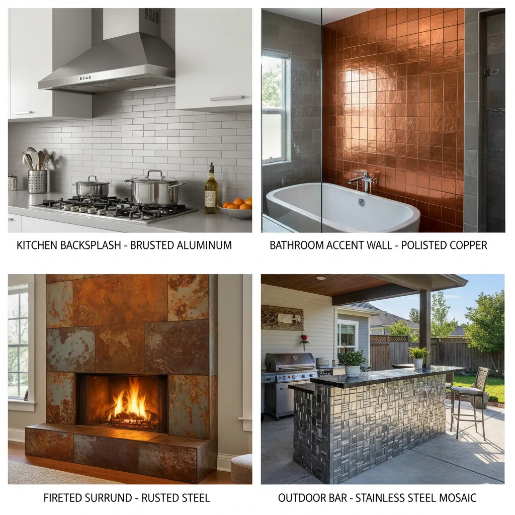Fireplace Surrounds: Heat-resistant metal tile (stainless steel, brass) frames fireplaces, creating a bold focal point in industrial or modern living rooms.