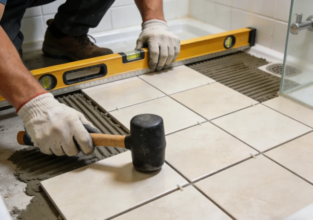 • Nano Banana Image Prompt: Professional contractor installing shower tile floor with a level and rubber mallet, wearing work gloves, bright bathroom setting, realistic action shot, 8K high resolution, no watermarks.