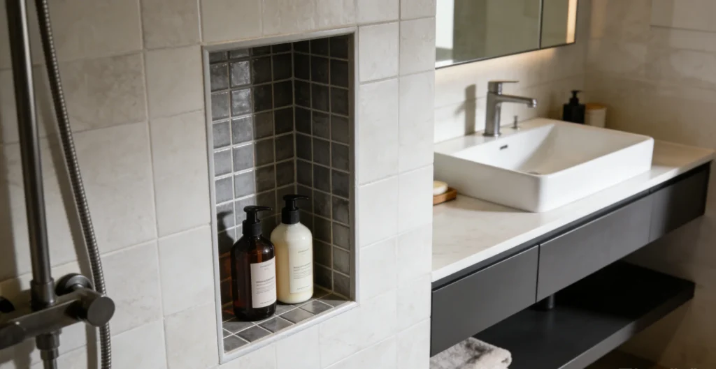 Many people assume that small bathrooms need small tiles. Actually, the opposite is often true. Using large-format bathroom tile reduces the number of grout lines. Fewer grout lines create a less cluttered, more expansive look, which is a foundational principle in small bathroom design ideas.